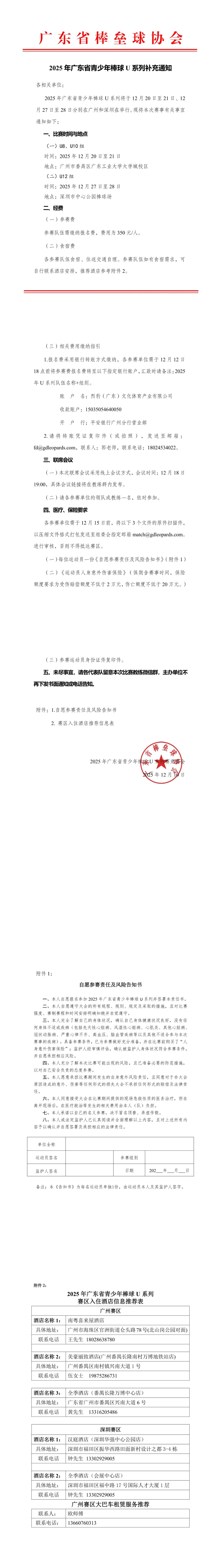 赛事通知 2026-01-02 08:08 2025年广东省青少年棒球U系列补充通知 郭璇 广东省棒垒球协会 2025-12-11 11:00 广东 原文链接 点击下载附件:附件1:自愿参赛及风险告知书.docx赛事/青训/裁判/教练/培训/对外交流