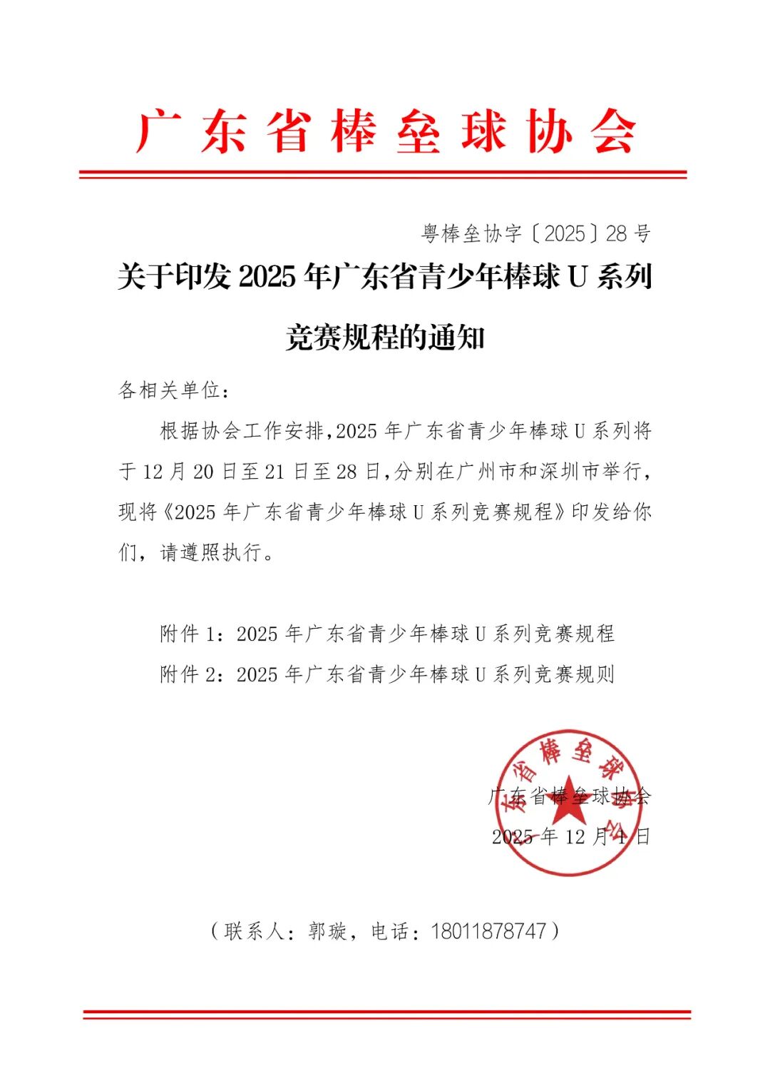 赛事通知 2026-01-02 08:08 关于印发2025年广东省青少年棒球U系列竞赛规程的通知 郭璇 广东省棒垒球协会 2025-12-01 09:53 广东 原文链接 文末留言板块,下载报名表链接